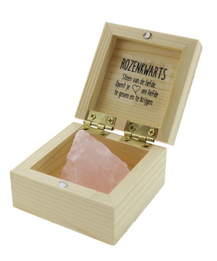 Brok van rozenkwarts in een houten kistje met de tekst: