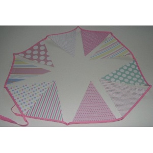 Zeer aparte vlaggenlijn stippen en strepen, met een roze stoffen band en de vlaggen zelf zijn van dik stevig karton.