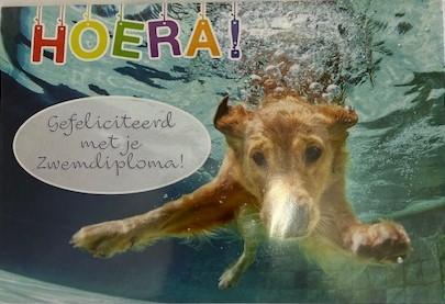 Wenskaart hoera gefeliciteerd met je zwemdiploma hond onder water