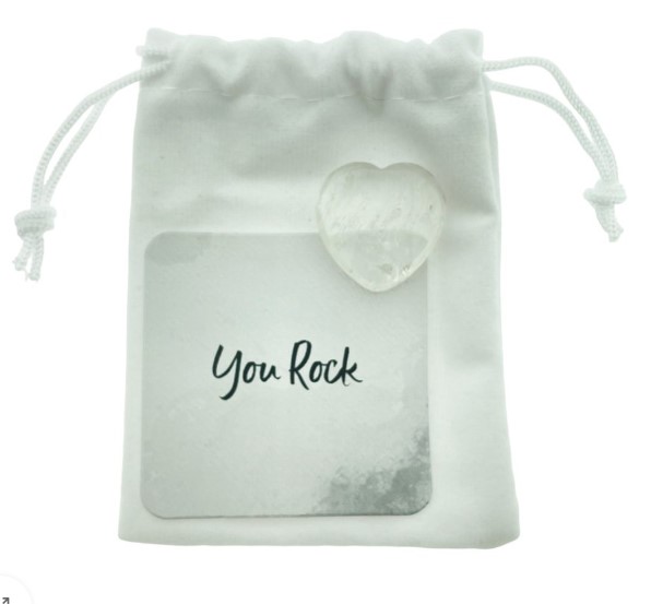 Edelsteen bergkristal hart met kaartje You Rock in een wit fluwelen zakje.