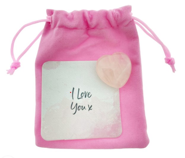 Edelsteen rozenkwarts hart met kaartje I love you in roze fluwelen zakje.